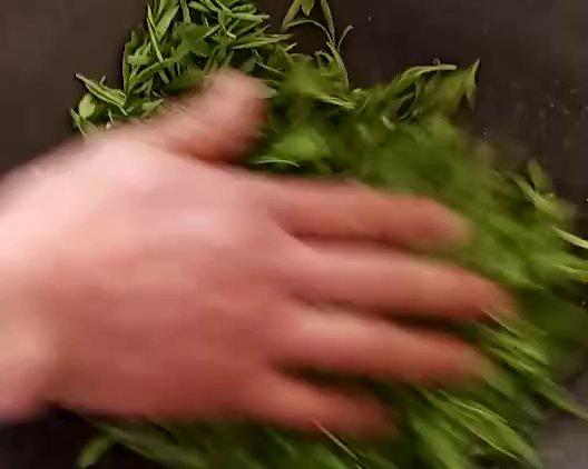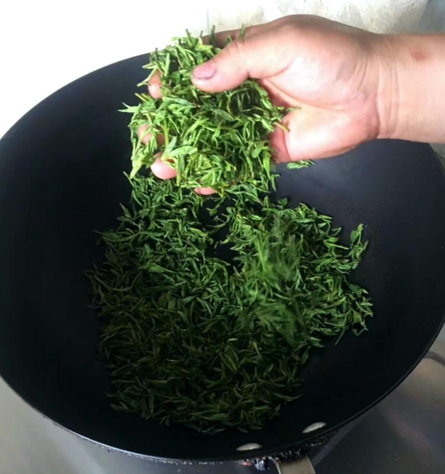 杀青。炒青,用高温杀死叶细胞。用铁锅,开大火。将炒锅空锅烧热130度左右,投入茶叶。