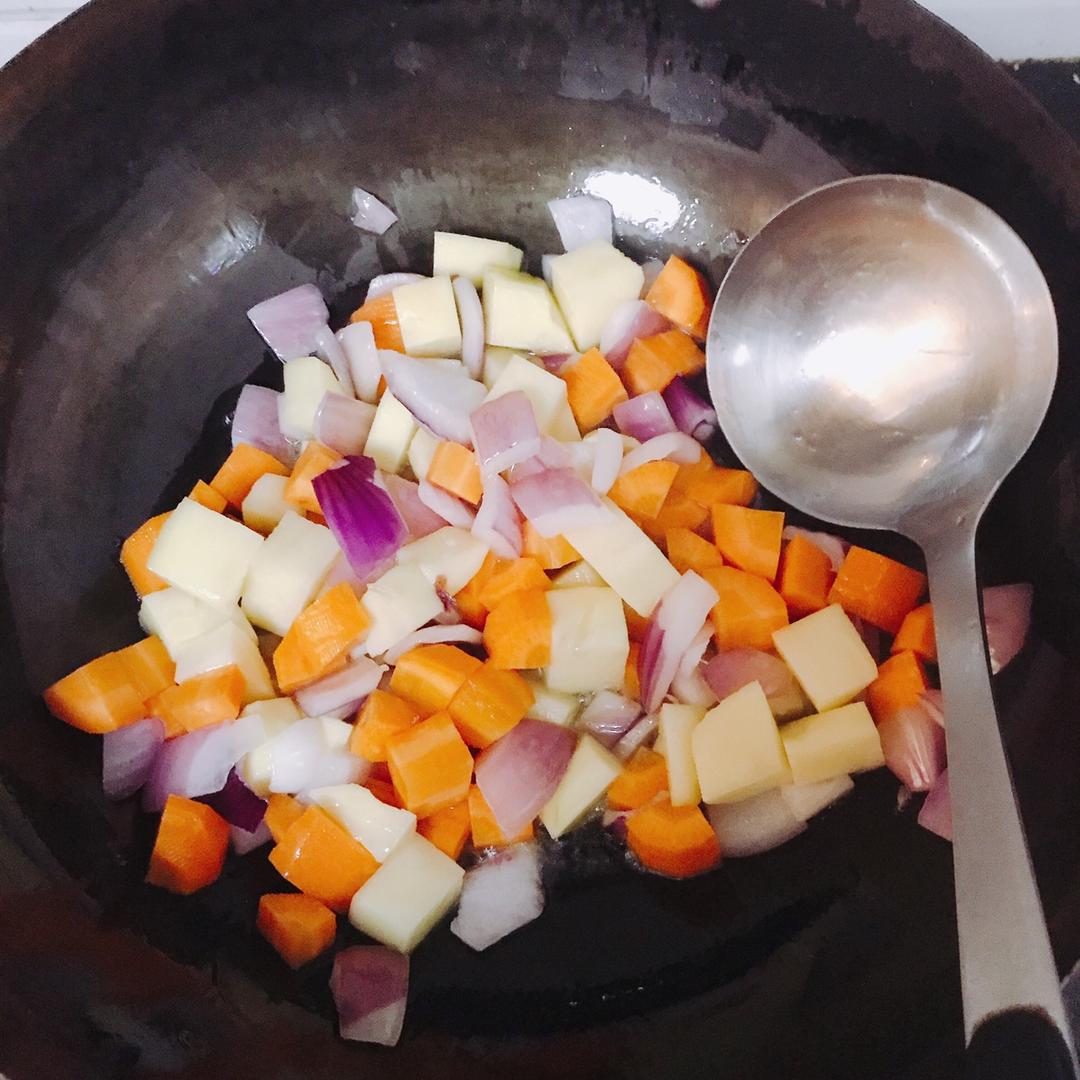 锅里放2瓷勺油烧热,加入洋葱丁,不停翻炒,洋葱炒到有香味,颜色变透明、加入土豆和胡萝卜一起翻炒2分钟后,把鸡胸肉沥去汤汁,倒入锅中一起炒到肉变白。