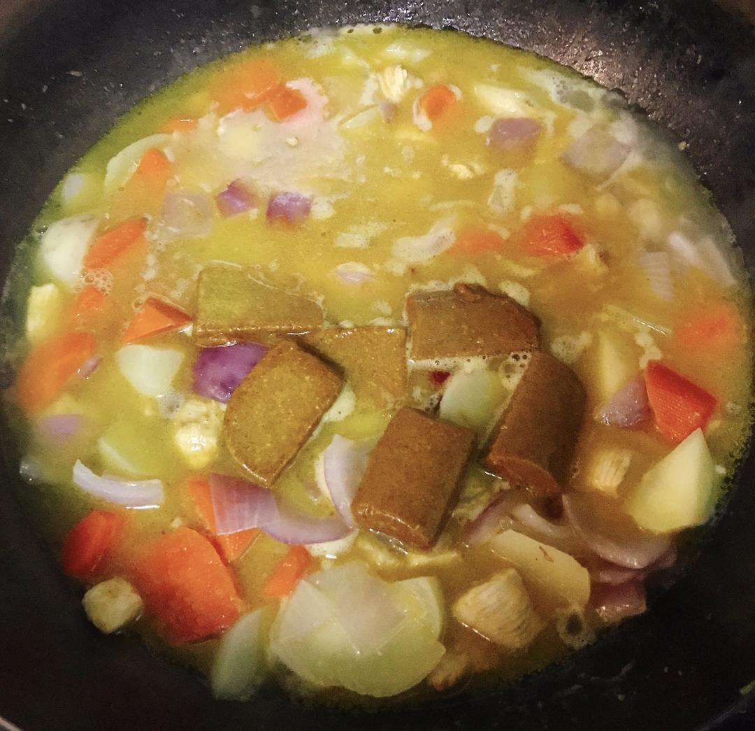 加入水没过土豆块和胡萝卜、大火烧开后撇去浮沫、放入咖喱块不停搅拌。