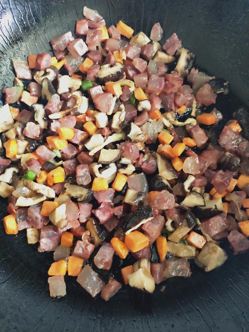 放比平时炒菜要少的油,只需要一点点,防止菜粘锅焦糊,(因为香肠还会出油,并且粥太油腻也不好吃)炸香姜丝葱段,先加入胡萝卜丁翻炒,然后依次倒入香肠丁、香菇丁,放一点点五香粉,稍微翻炒一会,放锅里待用。