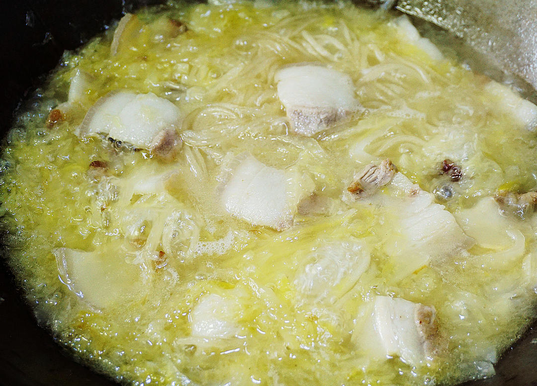 酸菜加水煮开后放入粉条,调入少许白糖提鲜