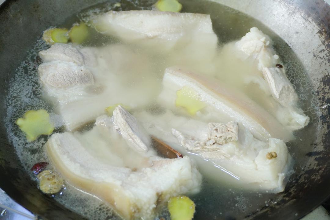 五花肉加姜片及料酒煮沸去腥,我煮这么多,是有一大半用来做回锅肉了哈~