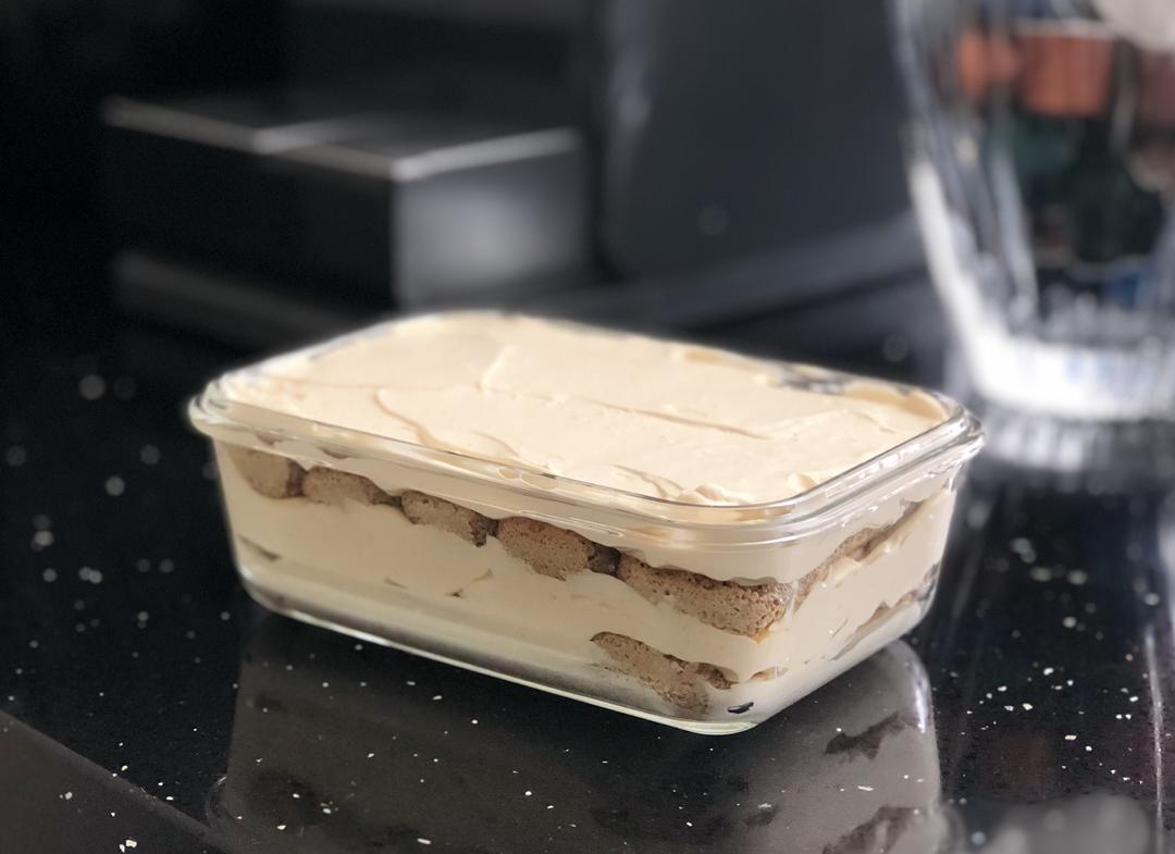 在第一层奶酪糊上铺一层蘸过咖啡的手指饼,再铺一层厚奶酪糊,再铺一层手指饼,再铺一层厚奶酪糊,根据容器高度决定是否重复操作再加一层。