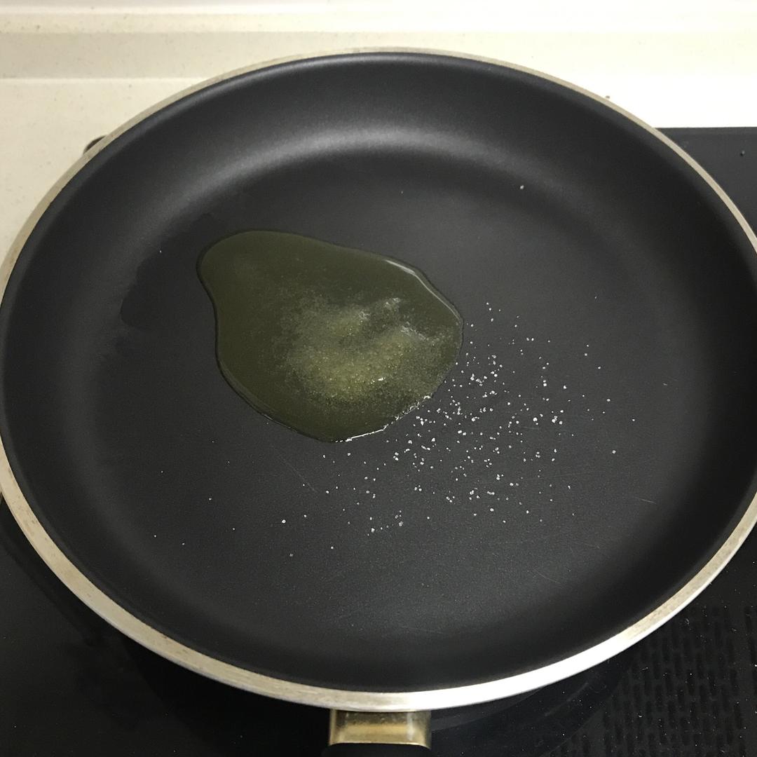 不粘锅烧热放入植物油,油热后放入白砂糖,调中火到糖化开,化开后调小火搅拌到糖冒泡,关火用余温继续搅拌。