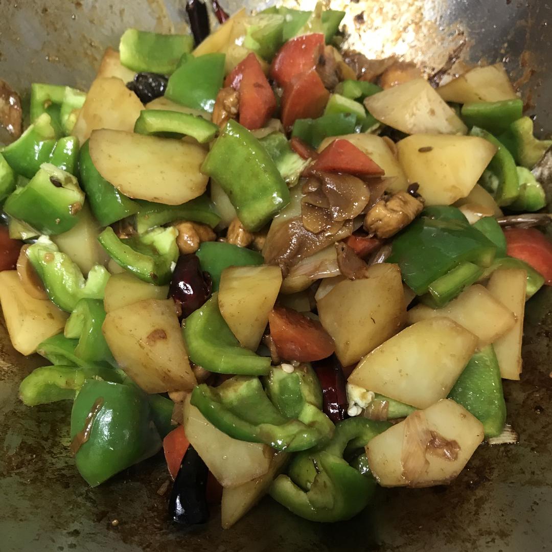 土豆、胡萝卜切滚刀块,青椒切块。切大一点。