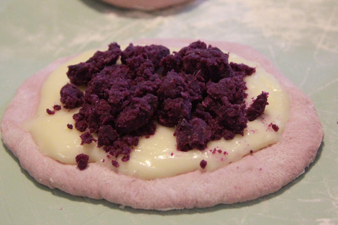 取一个面团压扁排气,擀成大圆形,戴手套,取适量的麻薯拉开拉长铺在紫薯面团上,再取适量的搓散的紫薯,铺在最上面。满满的,大满足(不考虑减肥的朋友可以提前把紫薯用细砂糖和黄油炒一下,炒成紫薯馅儿,再铺上去更更更好吃😋!)