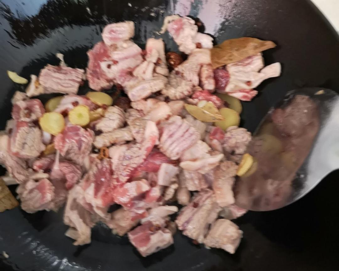 加油,4成热下调料姜、蒜、大料、辣椒、八角、花椒等自己喜欢的调料,炒1分钟左右,下料酒,酱油继续炒1分钟。