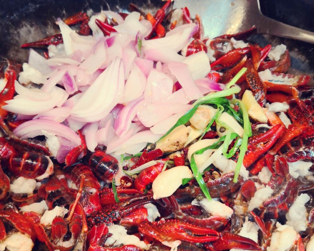翻炒到大部分小龙虾变红色加郫县豆瓣酱,洋葱,葱姜蒜花椒干辣椒,翻炒均匀。