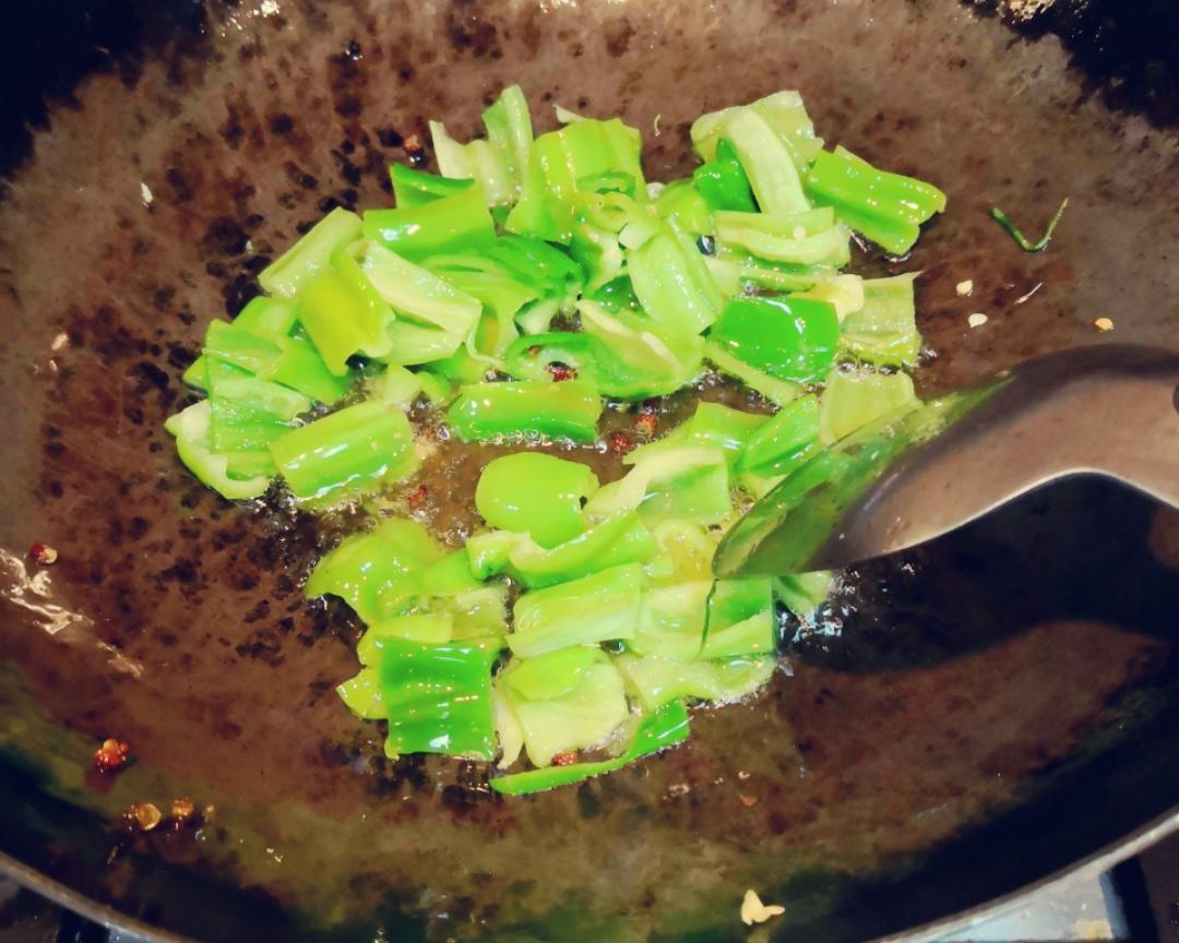 煸炒一下薄皮辣椒,盛小碗备用。(油留锅中)