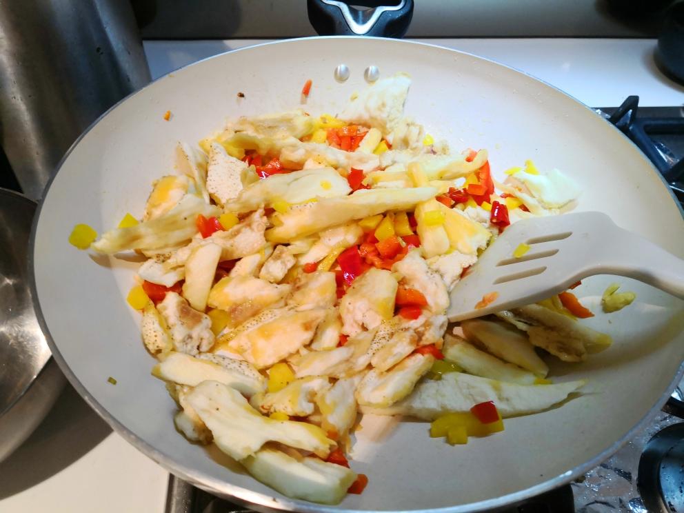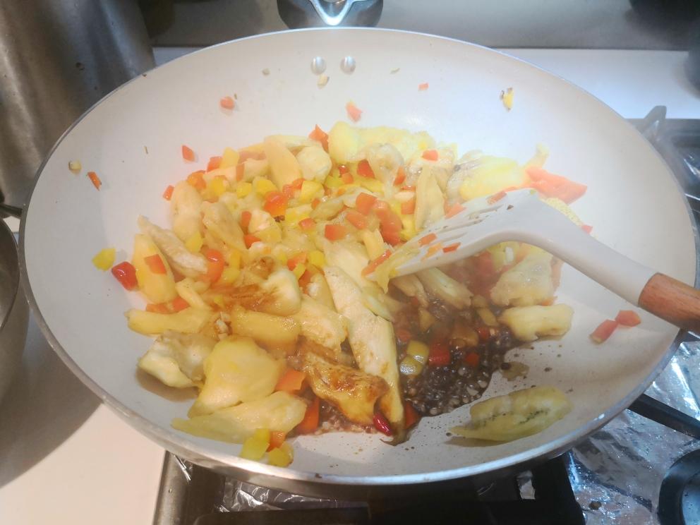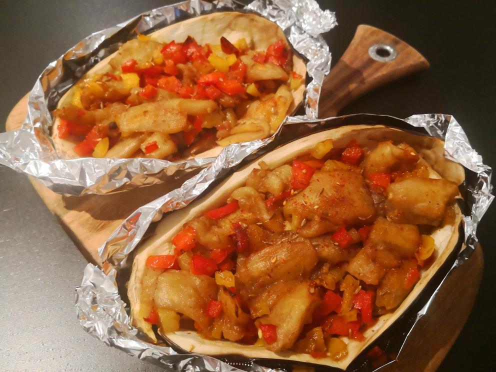 上锅,其实这个时候就可以吃了,但是进阶版的茄子和椒不允许止步于此!把炒好的料倒进茄子皮里,要先用锡纸包好茄子皮喔!