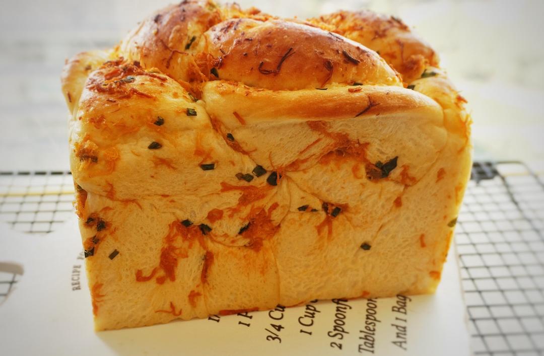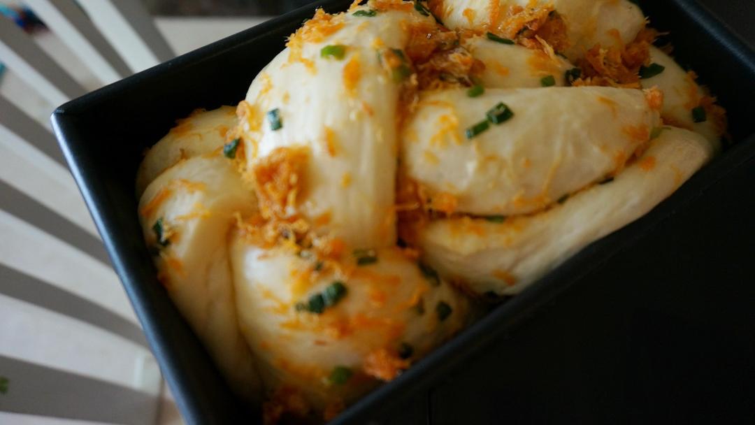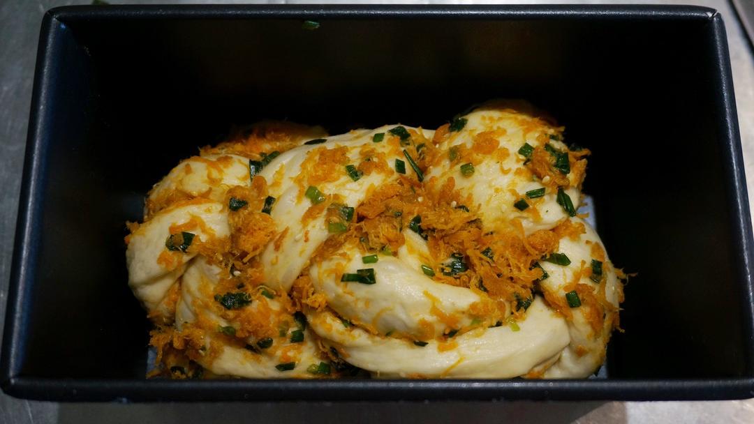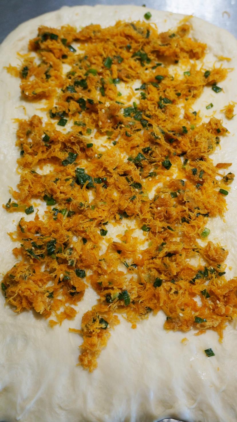 将面团擀开,成长方形。大概25宽,30长。翻面,在表面(也就是擀开时在下面的那一面)铺上肉松香葱混合的馅料