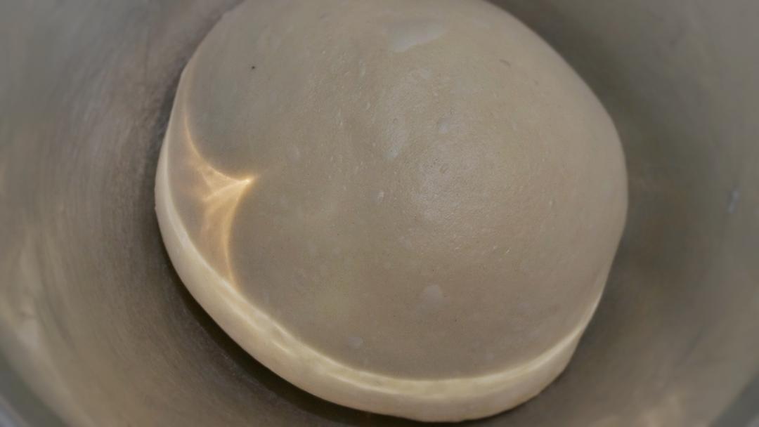 发至2倍大小,大约50分钟,新鲜酵母特别容易发,如果是干酵母,发酵的时间会长一些。拿出面团,排气,滚圆,松弛10分钟。