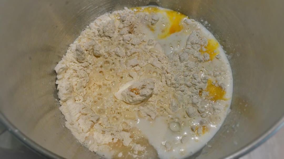 把除去黄油的部分加在一起,厨师机揉面至盆壁光滑有厚膜