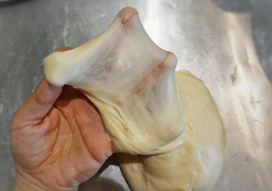 加入室温软化的黄油,开始以低速揉至面团完全吸收黄油,转高速打至手套膜