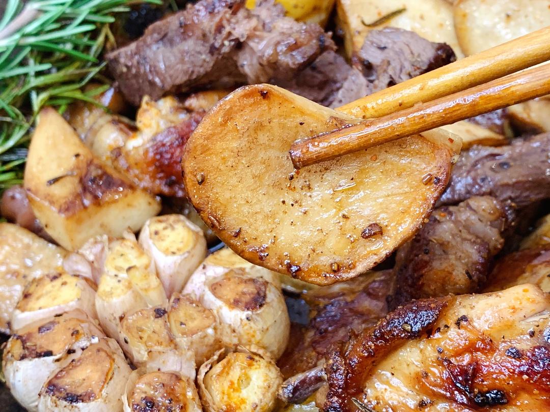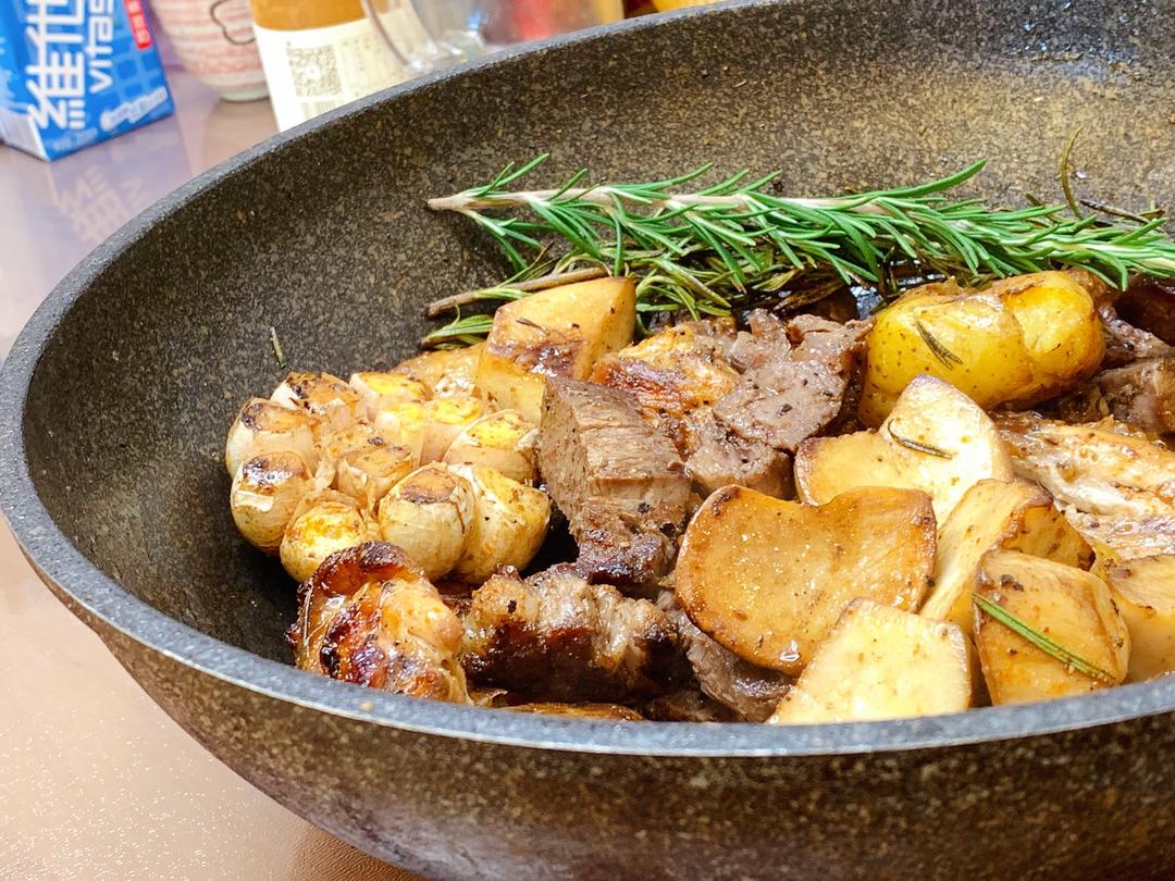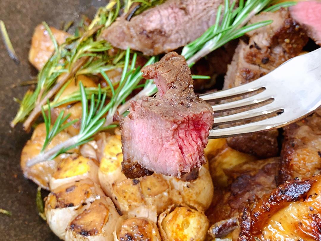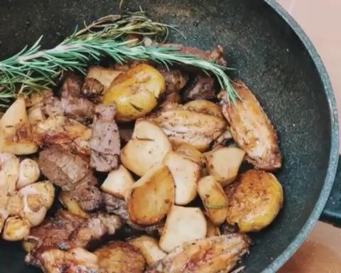 土豆和杏鲍菇充满了迷迭香、蒜头、牛排汁的香气。