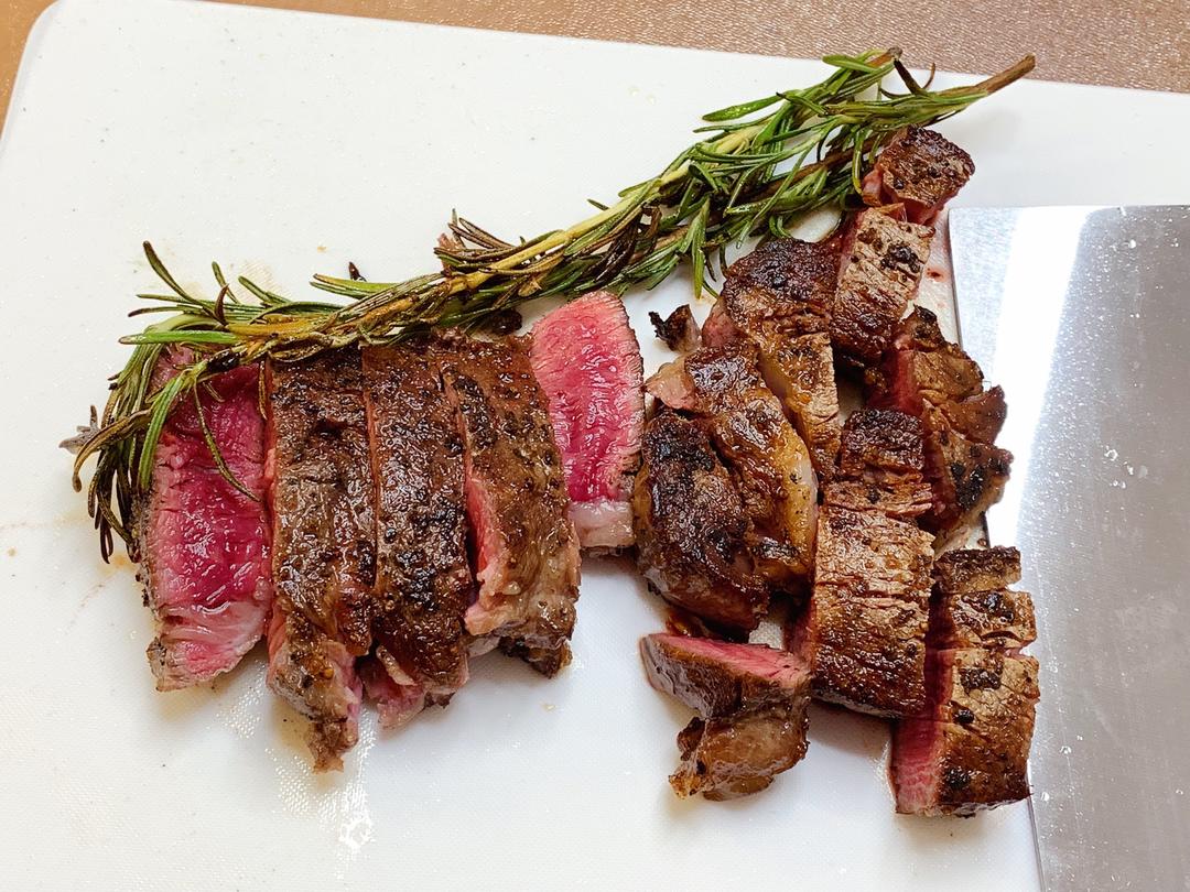 将煎香的迷迭香和牛扒出锅,牛排冷却3分钟后切小块备用。牛排5成熟如图颜色。