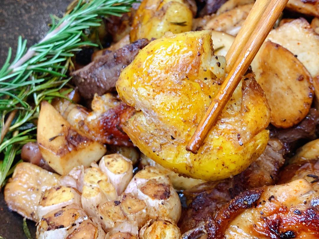 1:选用高山小土豆大小适合风味更佳。 2: 小土豆轻压扁。蒸熟的小土豆会变的非常绵软。 3:牛排第一次烹饪大概3成熟,第二次达到5成熟,最后翻炒达到7成熟。火候和时间要控制好。 4: 煎完牛排的油脂千万不要倒掉,里面有紫皮蒜和迷迭香的香味,这是风味的精华。