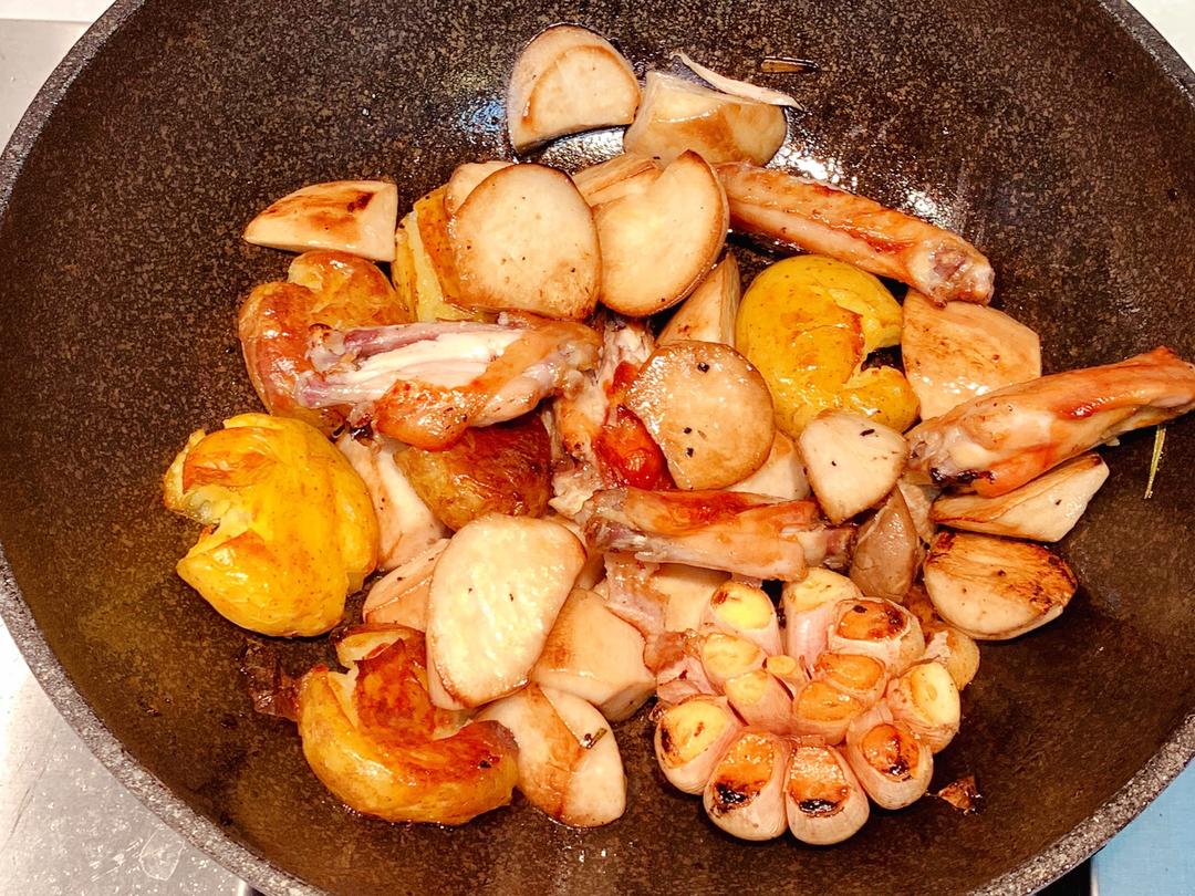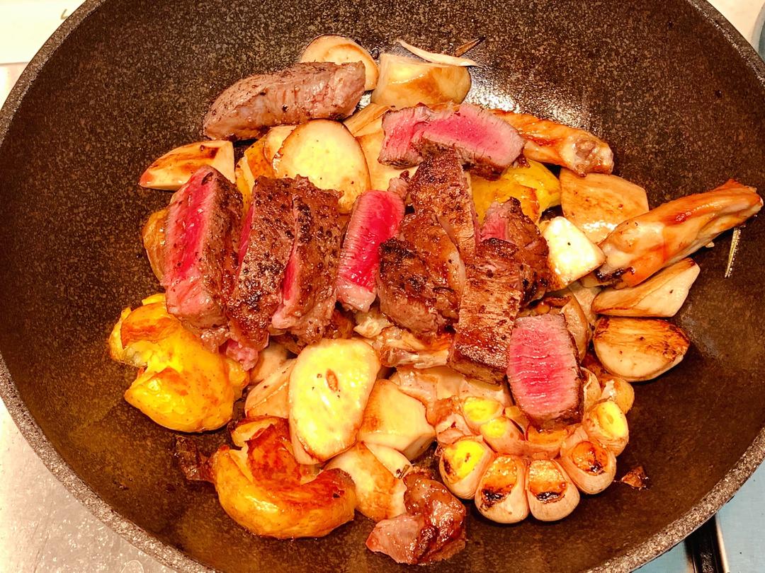 煎完牛排的油脂千万不要倒掉,里面有紫皮蒜和迷迭香的香味,这是风味的精华。锅中加入一些新鲜橄榄油,将杏鲍菇,烤制好的小土豆和鸡翅加入。稍微翻炒一下,让土豆和蘑菇吸收香味和油脂。