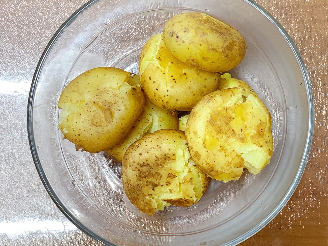 用厨刀将高山小土豆轻轻压扁。蒸熟的小土豆会变的绵软,注意控制力道。