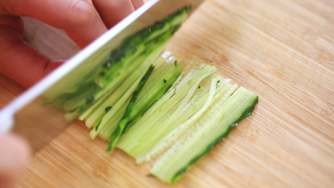 黄瓜切丝,胡萝卜切丝,葱切葱花,姜切末,蒜切末。
