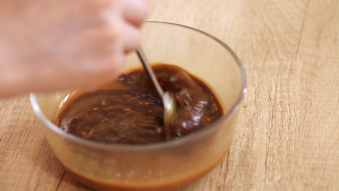 黄豆酱加水稀释,倒入1/4份的甜面酱并搅匀。注意哦,稀释后的黄豆酱与甜面酱的比例是4:1哦。