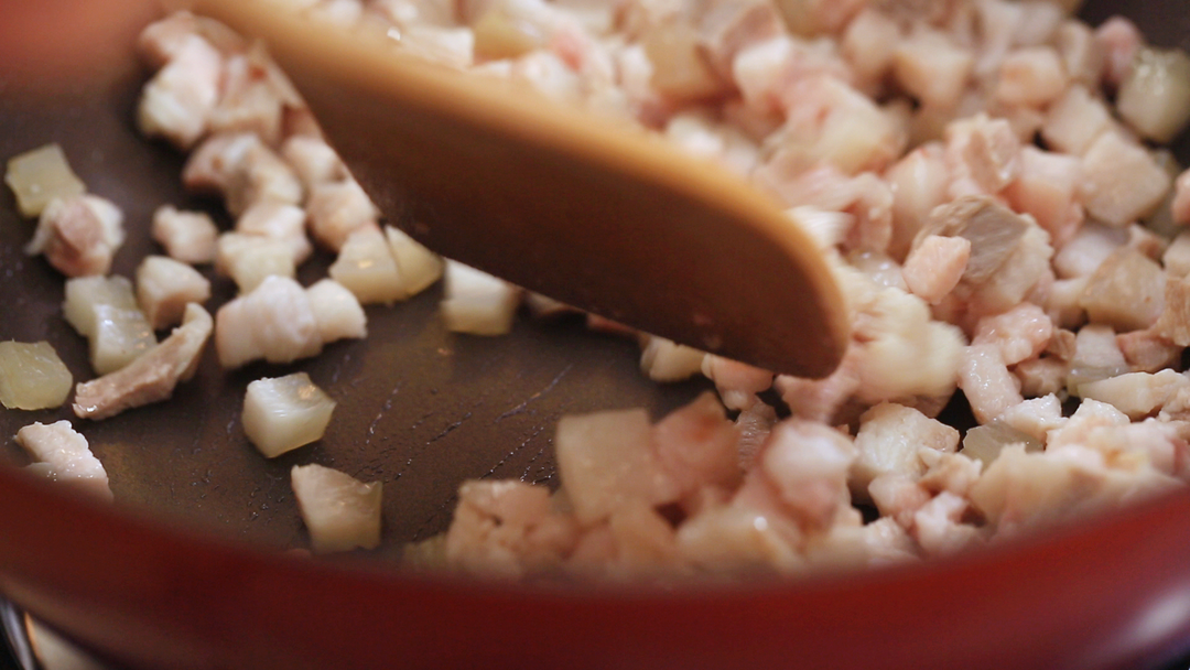 锅烧热后不放油,倒入肉丁,小火翻炒至变白。