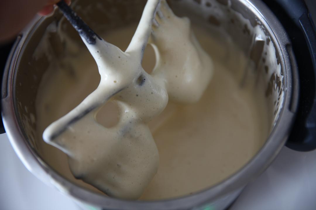 加入30牛奶, 30玉米油, 80克低筋面粉,5秒/速度3混合,取出蝴蝶棒,如有未搅匀的,可用刮刀辅助轻轻拌匀。