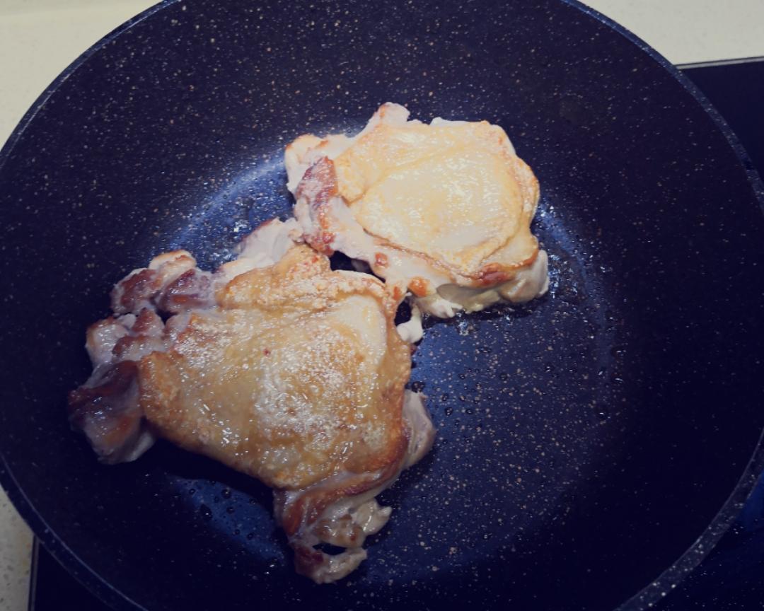 !!!开稍微大点的中火!!! ~鸡皮朝下~开始煎,用铲子按压鸡腿肉能使其均匀上色~