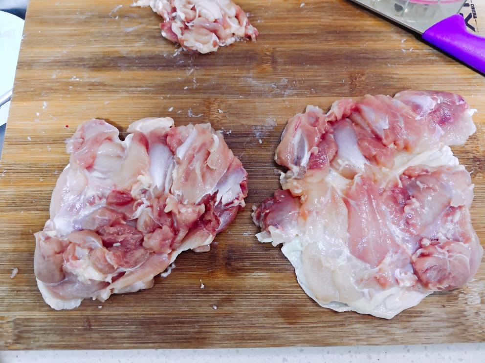 剔好后的鸡腿肉,整块鸡肉切成厚度均匀平整的片!