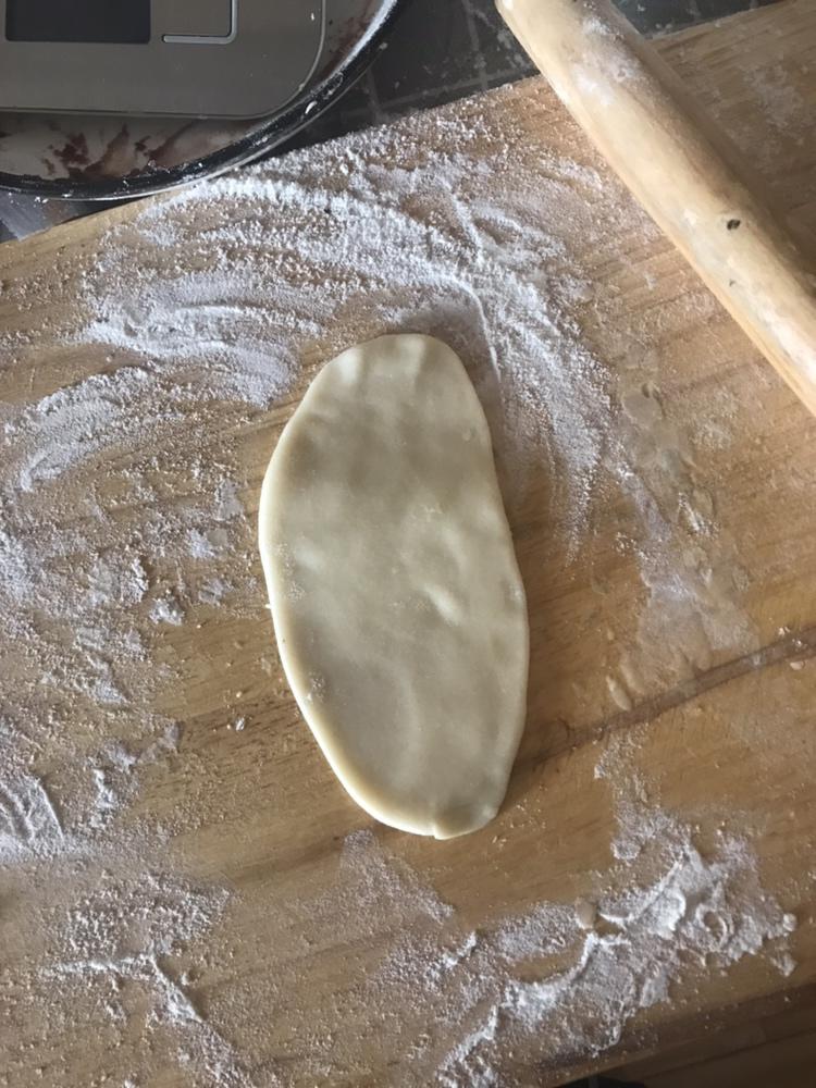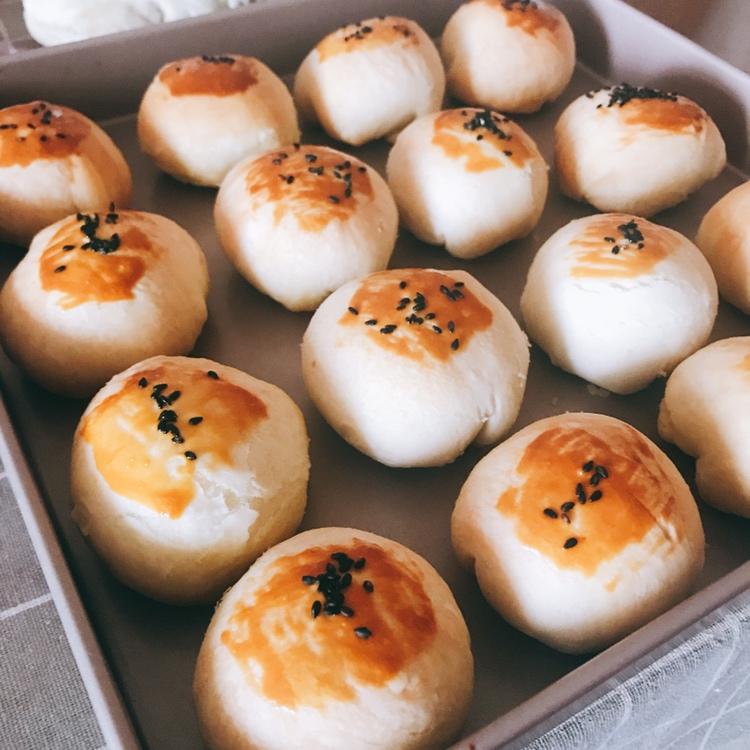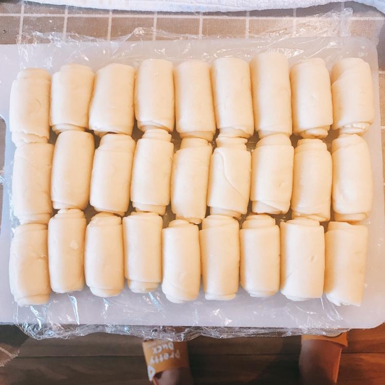 没拍,偷个图,经过两次醒后,按中间折叠,擀成面皮,把包好的豆沙蛋黄球包好,闭口处冲下。