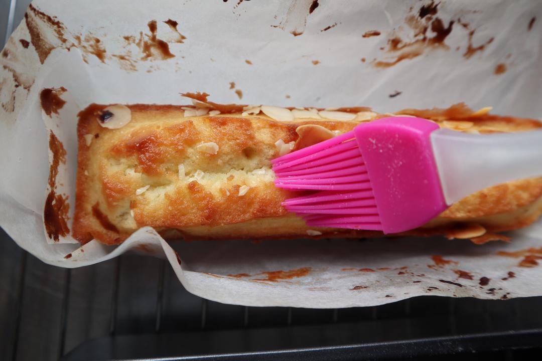 将糖水材料放入小锅中加热,并放入香草荚熬煮,沸腾后关小火,大约煮三分钟左右即可,趁着蛋糕还有温度刷糖水,也可以直接用白色的麦芽糖浆刷表面~