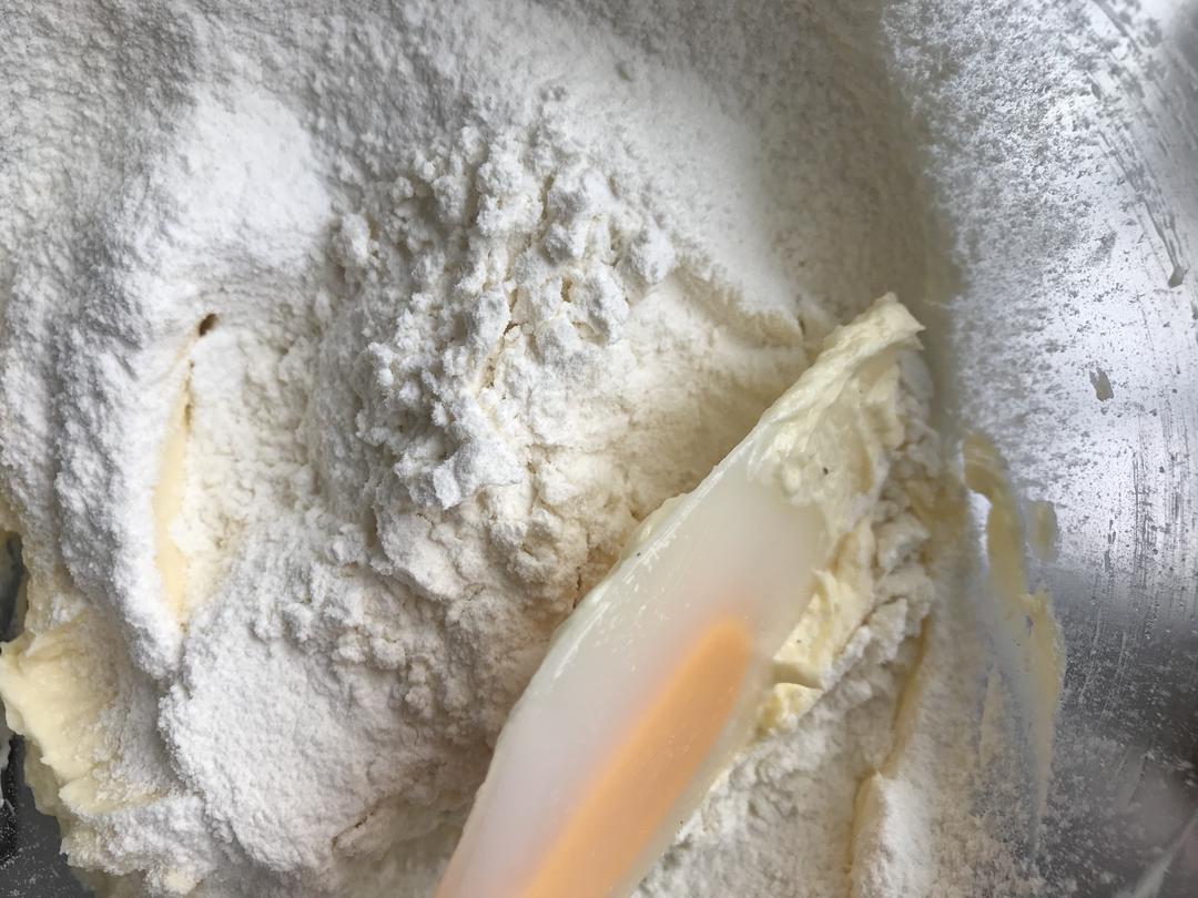 筛入低粉和泡打粉,用翻版的手法并用刮刀按压至无干粉,大约35次后就没有干粉了~