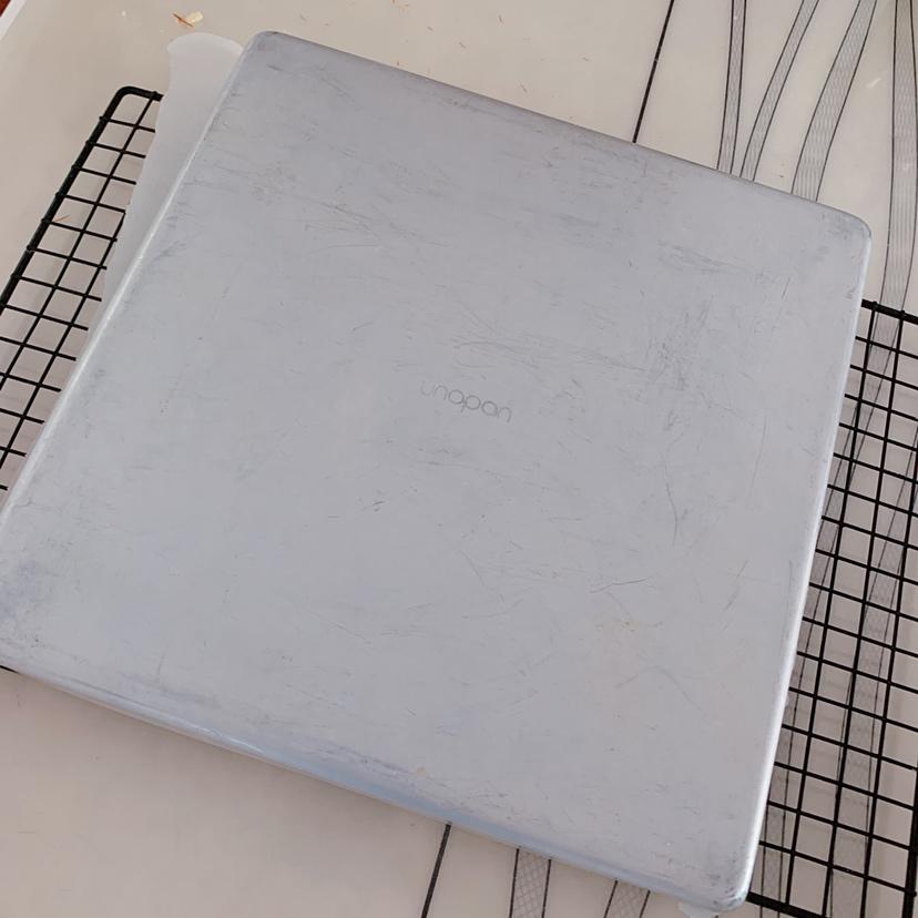 烤好的蛋糕体放地上震一下,倒扣在晾网上面。