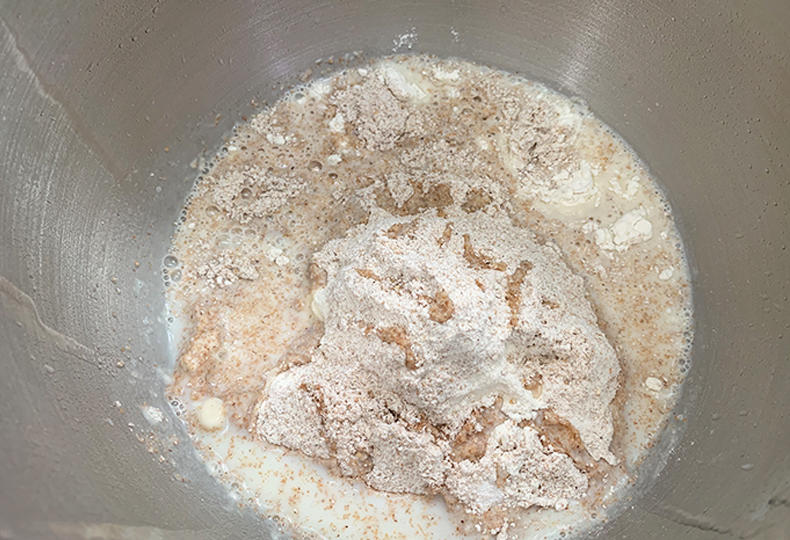 首先在配方里的牛奶取出20g常温牛奶把酵母化开,然后把高筋面粉、全麦粉、盐、脱脂牛奶全部放入搅拌盆中,然后把酵母水倒进去没有盐的那一边,用慢档揉成团,然后转中快档揉光滑。