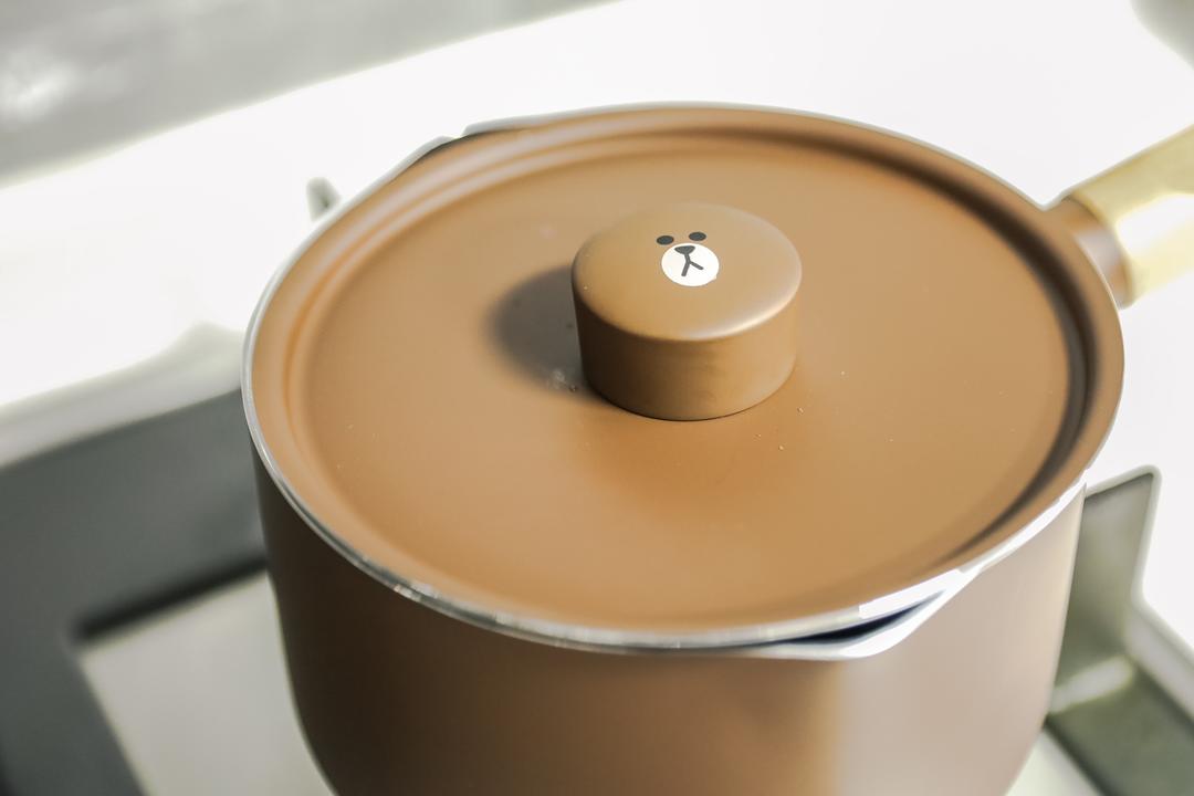 一口不粘奶锅很重要😂不然煮的时候会结在锅底。 布朗熊锅炒鸡可爱!