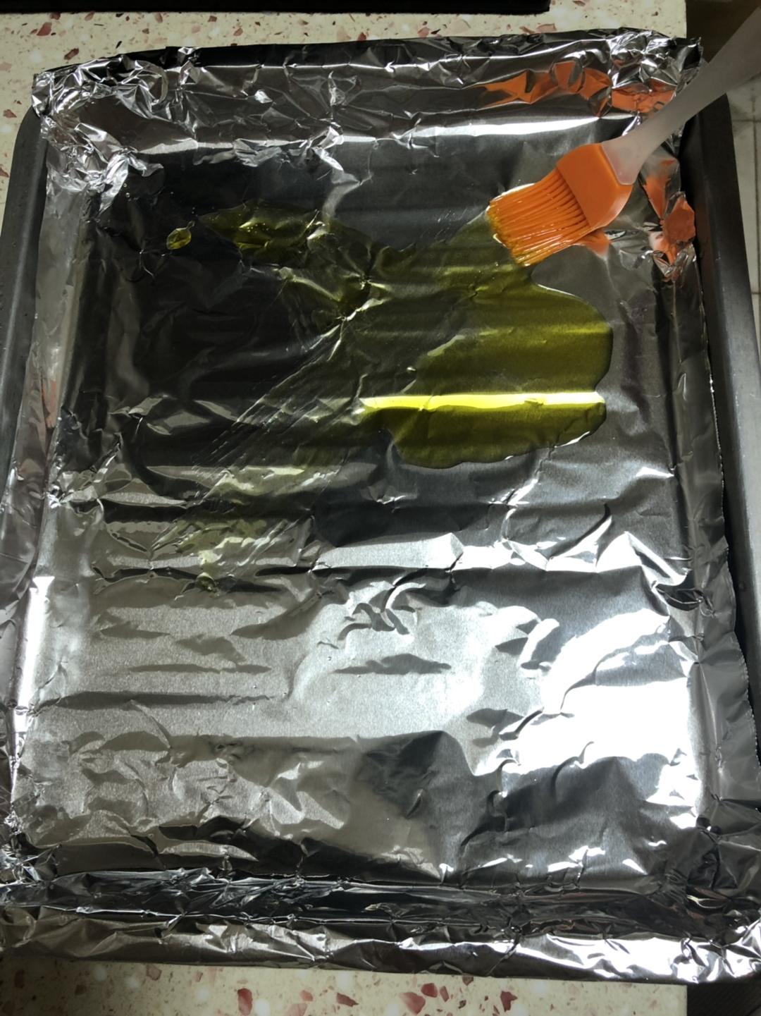 烤盘里铺上锡纸,刷上“生的”菜籽油