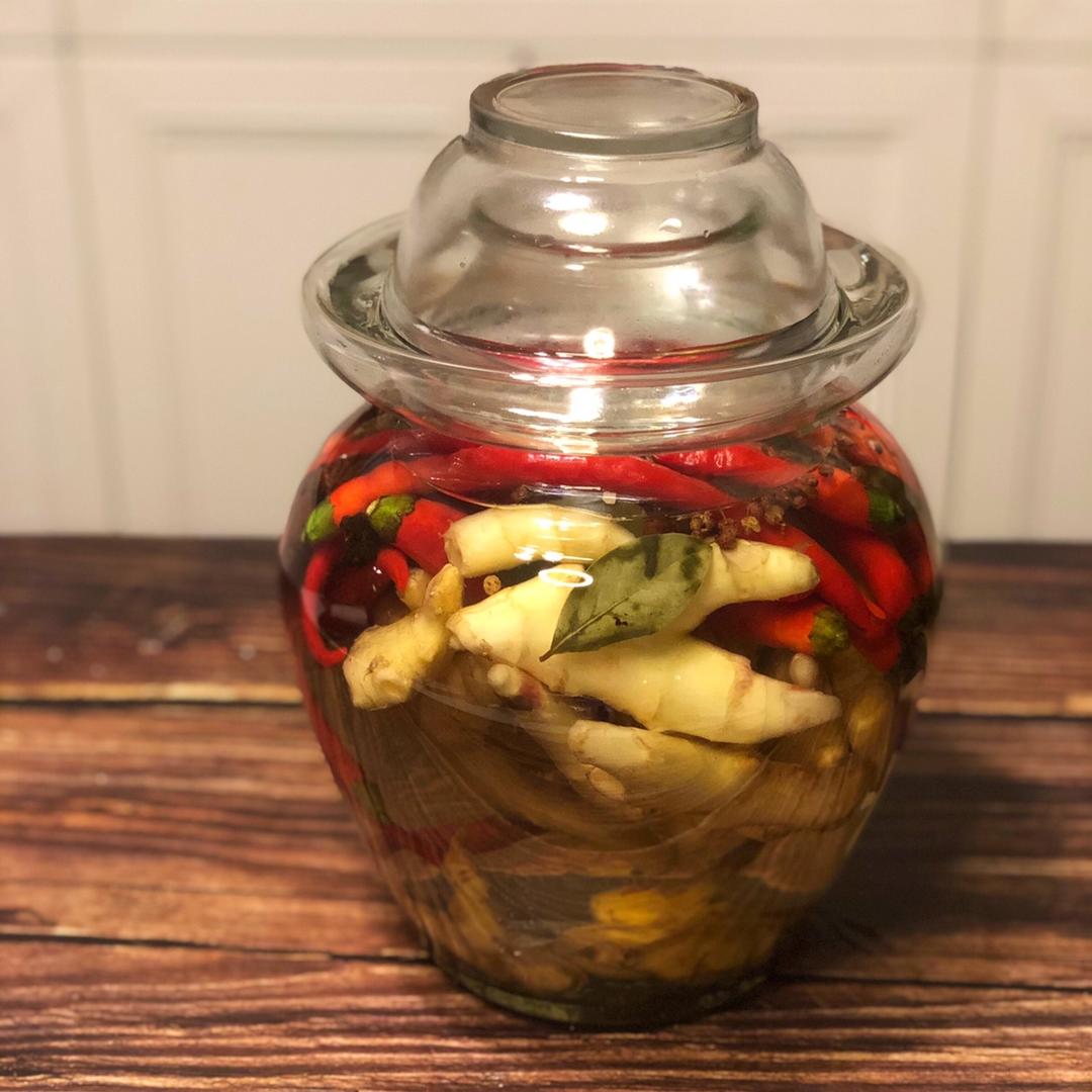 最后再倒一点点高度白酒,盖上坛盖,倒上坛弦水封坛。放在阴凉痛风处,静待酸香~早上配蛋炒饭~简直了~