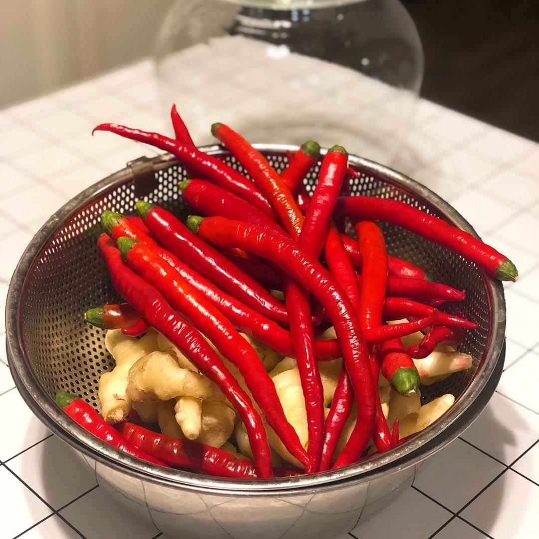 把要泡的菜洗干净晾干,因为我这是泡来炒菜的,所以我只泡了辣椒和子姜,你可以按个人喜好泡萝卜,豇豆,包菜,芹菜等等。