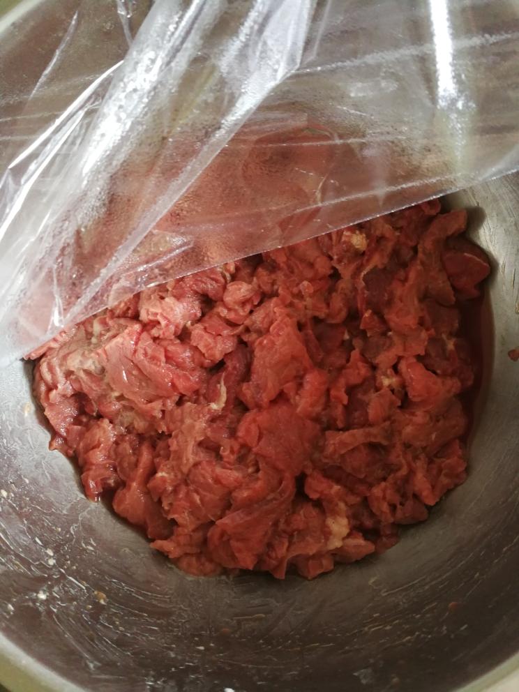 牛肉(上脑,里脊,黄瓜条都可以)切薄片,用料酒,盐,白胡椒粉抓匀,再放入淀粉抓匀,腌制15分钟