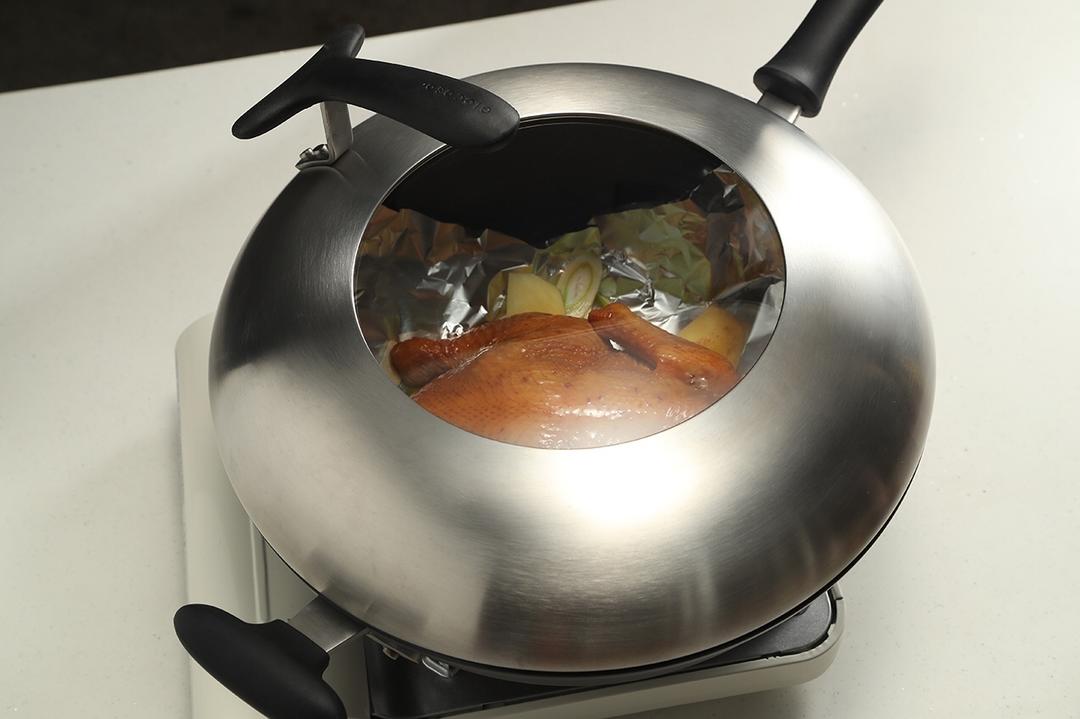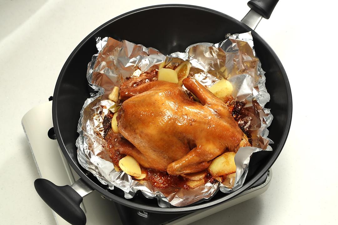 这是一道不需要烤箱的烤全鸡!此锅耐干烤多功能炒锅,实验数据显示耐干烧500度连续300小时不变形!
