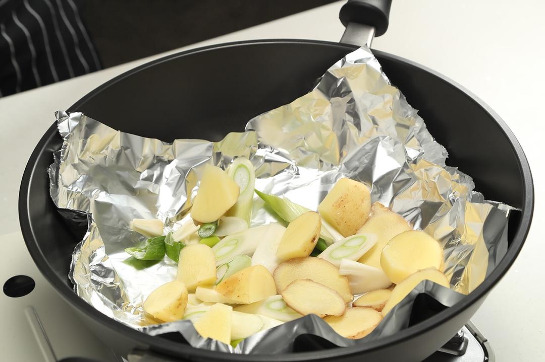 把切好的蒜片、姜片、大葱片铺在锡纸上。