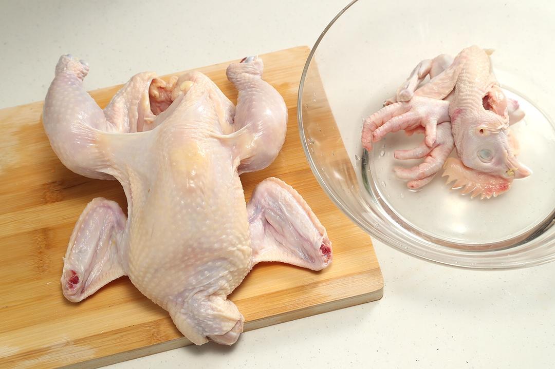 鸡身清理干净后,剁去鸡尖、鸡爪、鸡头、鸡屁股。