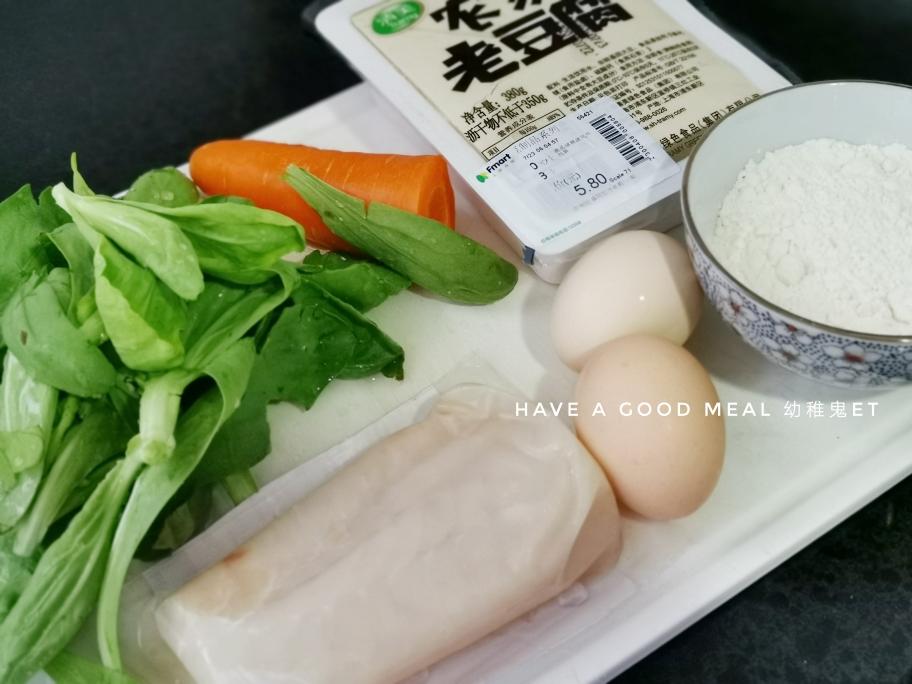鳕鱼、绿叶菜、胡萝卜、全部切碎,老豆腐碾碎备用,打入俩鸡蛋