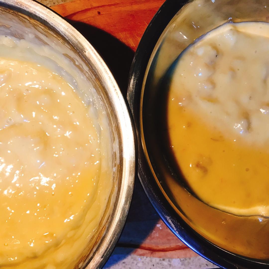 ❥ 搅拌好的面糊等分成两份,备用。