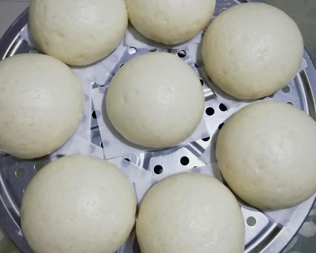 常温发酵二倍大(我现在的气温30度左右,直接放锅里盖上锅盖大概发酵半小时左右)(天气冷的时候可以锅里放水烧至温水后关火,把包子放入锅里盖上锅盖发酵)。