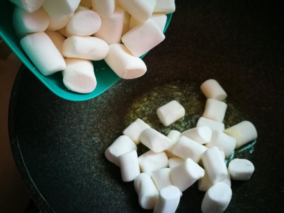 黄油融化后倒入棉花糖,全程小火! 用刮刀轻轻翻炒压拌让棉花糖慢慢融化。