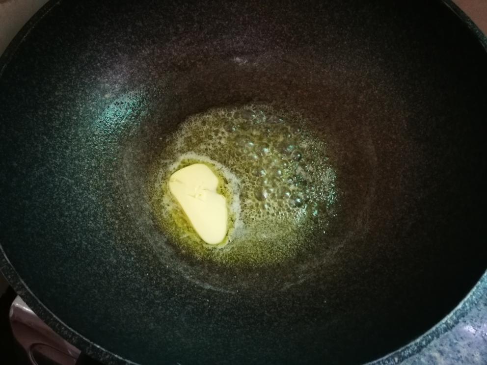 黄油倒入不粘锅,小火慢慢融化,然后轻轻晃动不粘锅,让黄油均匀的铺满锅底。