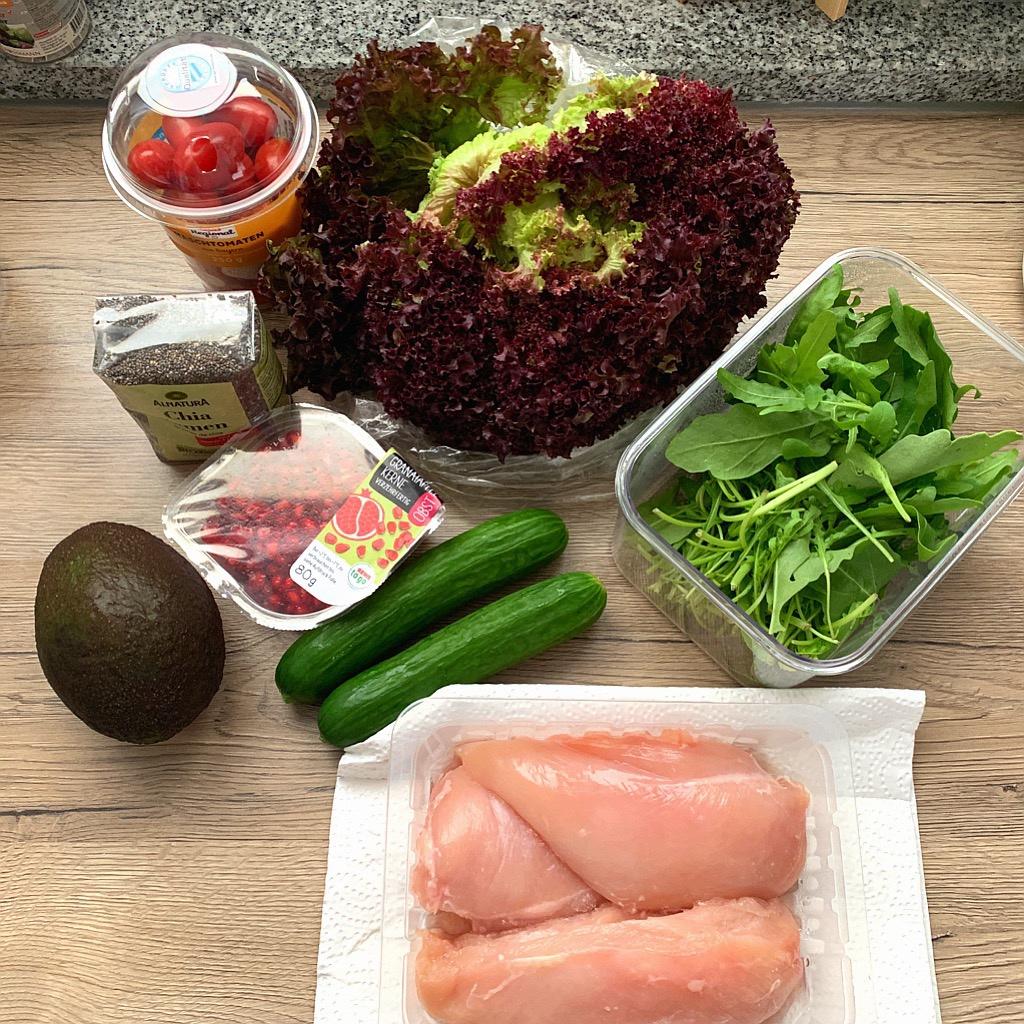 蔬菜类全部洗净,生菜/红边菜和火箭菜撕成小片,小青瓜切片,樱桃番茄对半切开/番茄切丁,红石榴剥好,牛油果切丁,加入奇亚籽,混合好后,铺上鸡胸肉,加入自己喜欢的酱汁就可以咯~