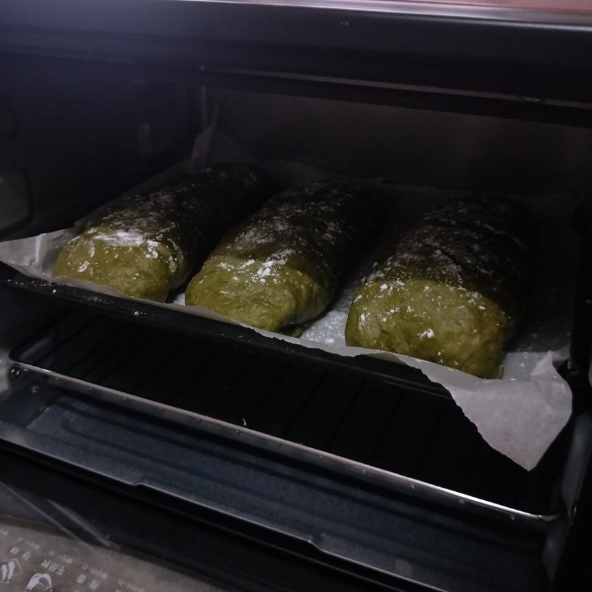 卷好后 等面团发酵,可以在烤箱下放一碗热水