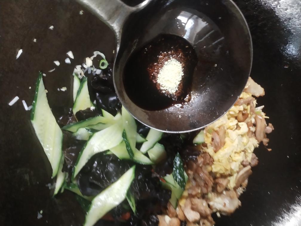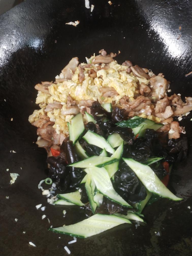 再把焯好水的木耳黄瓜和炒好的鸡蛋肉片放入锅内。翻炒两下后准备调味。